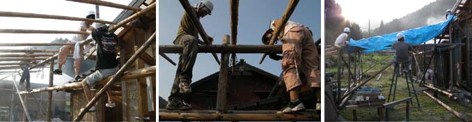 両側の軸組が出来上がるころには、皆、番線締めに慣れてきて、作業は順調にはかどりました。4時ごろから、五右衛門風炉の掃除と薪焚きをユースケとオミヤさんにやってもらいました。まだ焚き物に慣れていないせいか、煙が立ちこめて、煙いよ~。5時にはブルーシートで屋根を葺き終わり、6時には作業終了!みなさん、ご苦労様!川に行って遊んでよし!わ~い!