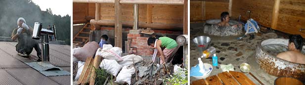 後は焚き口をもう少し狭めてやる必要がありそうです。木工の廃材を次々放り込んで燃やし、大きな二つの釜を焚いて行きます。およそ2時間ほどで炊きあがります。汗を流し、ゆったりと入ると、最高!夕方にはずいぶん涼しくなるので、8畳ほどの浴室は風通しがよいこともあって、心地よい空間です。石がごつごつした床は考えもんですが。