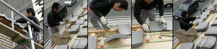 一方、上では屋根屋の仕事。京都の瓦葺きの技術の一端が見られます。今回は無地の鎌唐草で、一文字と同様、合端合わせがちょっとうるさい仕事となります。澱みのない手際で軒付けの瓦が仕込まれて行く様子は見ていて飽きません。順に写真を撮らせていただきました。左から順に、瓦土をこねて置きます。上手は手を汚しませんな。瓦座を瓦のカーブに合わせてディスクで削り、瓦がうまく座るように調整します。幾度も瓦を置き直して合わせています。よし、となれば、瓦を据えて銅線で結びます。合端を確認して出来上がり。
