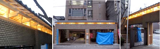 4月14日、電気工事も済んではじめて屋根の下に仕込んだ照明が点灯。さっそく写真を撮ってもらったのだが、こんな風に見えるらしい。(実はまだ見ていない。)これでちょっと目立つかな。冬、陽が落ちて暗い時間登校する夜間の学生には、明るくはなやいだ雰囲気はとても大事だ。この他にも板を張った後にスポット照明を考えているが、それまでしばらくはこんな感じとなる。