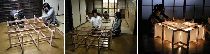 はじめまして、京都建築専門学校に入学したメグメグです。よろしくいおねがいします。さっそく町家研究室に入部?、さの先生の設計された民家風の建物に取り付く照明の制作をお手伝いさせていただいています。放課後、友だちを誘って先生が加工された骨組みを組立てました。どんな灯りになるのか、コピー用紙を貼って、ああでもない、こうでもないと友だちと議論しました。実際に電球を入れてみると、まあ、きれい。でも、どんな空間に懸かるんでしょう?