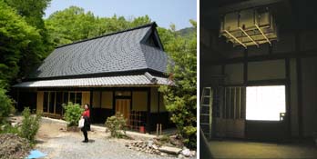 連休の最中、先生にその民家に連れて行ってもらいました。大きな古民家の再生建築だそうです。回りの紅葉の緑が眼にとても爽やかでした。中に入ると、薄暗い土間が。工務店に勤める卒業生の先輩が試作品を天井に掛けてくれました。紙のちょっとした貼る位置や吊る高さでずいぶん印象が変わるのに驚きました。白木のままの方がきれいと思っていましたが、建物の梁や柱と同じべんがらで塗った方が自然な感じになると思いました。さの先生、塗りましょう!(新入りメグメグ つづく)