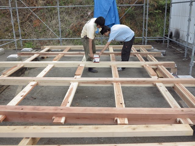 ユウヒさんが墨を付け、ババさんとモッチーさんが貫を加工しています。