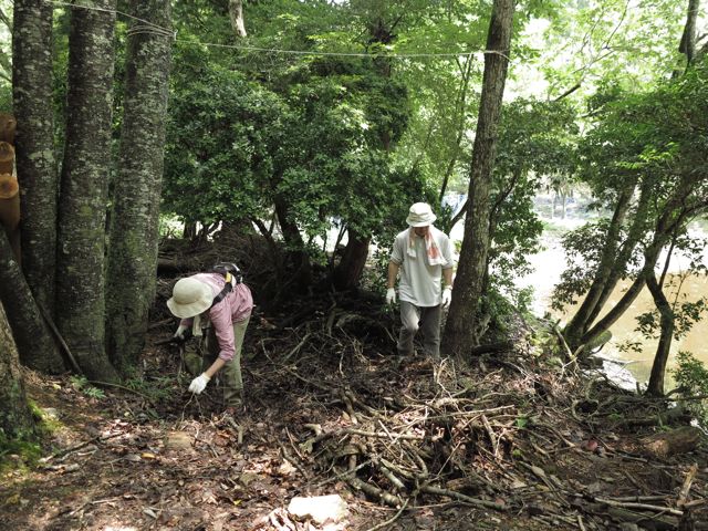 サノ先生と親子さんたちはツリーハウスの現場の掃除に。伐採された灌木の山を片付けます。大きなヤスデが出て来る出て来る!大きなナメクジ!これは山にいる種類だそうです。