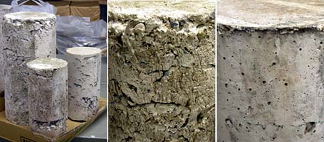 破壊の様子です。左が悪いコンクリート、右がよいコンクリート。悪いコンクリートは目標の37t(210kg/cm2)に対して、12t(70kg/cm2)ほどで破壊。1/3ほどの強度しか出ていません。よいコンクリートの方は42tぐらいで、まずまずですね。壊れたピースを見ても、悪い左側では、骨材がコンクリートに付着していないことがわかります。よい右側の耐えかねて壊れた風情に比べても、あっさり壊れている様子が見て取れますね。