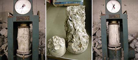 実験風景です。この手のコンクリートは破壊の際に破片が飛び散らないので、もっと近くで観察して欲しいよ~。試験機は年代物で細かなデータは取れませんが、何とか耐力は測定できました。