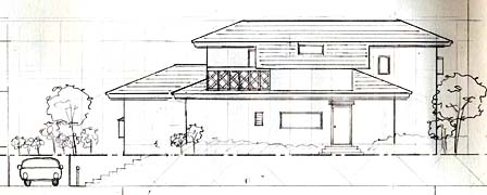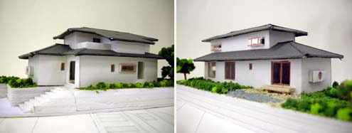 二階の屋根が一部下に伸びてくるところを違和感なく見せるのはなかなか難しいです。とくに屋根の表情に欠けるスレート屋根では、べったり伸びてくるので、気持ちが悪い。切妻屋根ならまだ処理がし易いのですが。みなさん工夫してみてください。屋根を切るかつなぐか、僕もときどき悩みます。