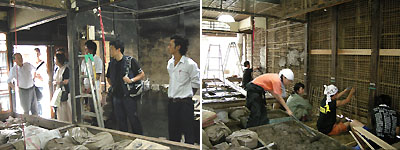 土壁を落とし竹小舞があらわになった大宮町家。朝から学生も作業中でした。