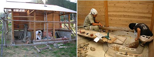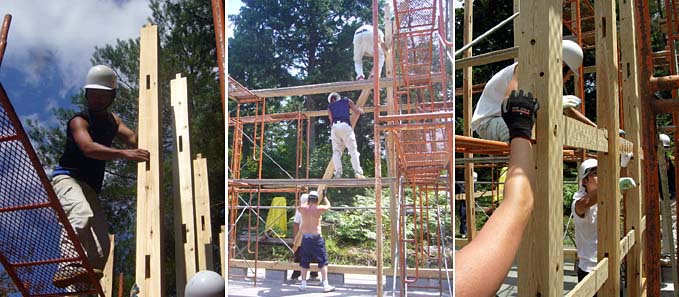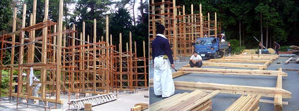 何にしても、大事なのはきちんと墨をつけて、レベルを正確に出しておくことです。学生たちも少しは水糸の使い方を覚えて来たようです。このブロックの上に板を載せるのですが、土台の丸太のくせを拾って仕込まねばなりません。丸太の皮を極力傷めない方が腐りにくいですからね。さて、うまく行くかな?