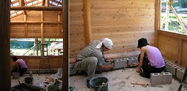 一昨年からのつづきとなる五右衛門風呂の完成を目指し、後半の木匠塾が始まりました。まずは浴室のフロアーを仕上げます。周囲に立ち上がりをコンクリートブロックなどで下地をつくり、床に水勾配をつけてコンクリートを打ち、モルタルを塗る予定です。