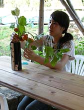 おや、?表ではれな君が花を生けています。家の横に生えていたホオズキがきれいな色になっていました。今日は近所の人たちを招いて夕食を一緒に食べようということになっているのです。陽も傾きかけて、会場つくりや食事の支度におおわらわです。おばあちゃんたちが楽しみにしてくれているようです。 (さのはるひと 夕食風景へつづく)