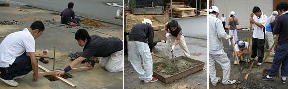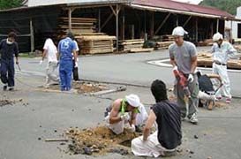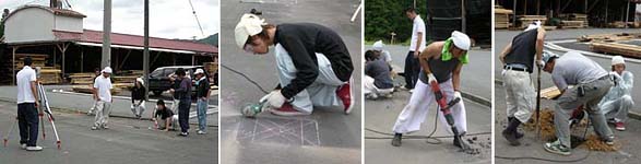 木工グループ全員で森林組合製品倉庫のアンカーボルトを据える工事をしました。トランシットで精密に芯を出し、レベルで高低差を実測、午後からホールダウンのアンカーのための基礎コンクリートを打つ穴を掘削。カッターでアスファルトを切り、ハツリで穴を開けて行きます。なかなかよく締まっていて、たいへん。雨がぽつぽつしています。
