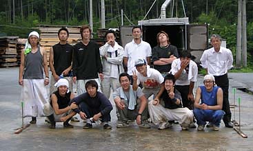夕暮れに近くなり、ようやく終了。皆、よく頑張りました。ご苦労様。なかなかいいチームワークでした。来週の日曜日はコンクリートブ ロック基礎の製作、これも手強い仕事になるだろうな。森林組合の勝山 さん、お忙しい中最後までおつきあいいただきありがとうございました。(組長 江浪でした。)
