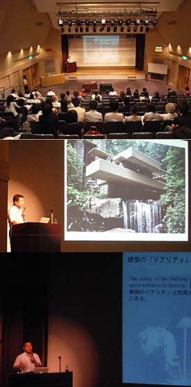 主に<落水荘>(1935)をめぐって、彼の後期のユーソニアンスタイルに展開する入口となる空間つくりが見られること、とくにコーナーを開けることで箱の閉じた空間からの脱却を試みていることなどが紹介された。