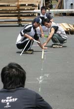 建築科2年生の木工卒業制作の実習課題として、京北森林組合(京都市右京区京北)の加工センターに製品倉庫を建てようと、この春から部材加工を行っています。この日は現地で倉庫の建つ位置を確認、縄張りと敷地のレベルを実測しました。間口が3スパン13.5m、奥行4mほどですが、敷地は平らに見えて、高低差は最大で30cmほどありました。