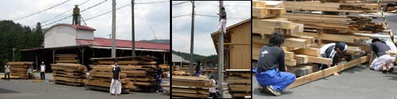 製品倉庫はこの製材工場で加工された京北の杉を用い、伝統的な貫構造で設計しています。さあ、頑張るぞ。 (以上、学生棟梁オクタからの報告でした)