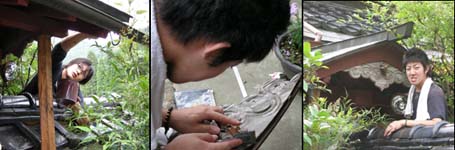 古くなった板は塗料をよく吸うので、すぐになくなってしまいます。塗り始めると、三間さんから、家の他のところにも塗って欲しいという話しが出て、さあたいへん。塀から門、門に接している戸袋、家の羽目板、柱、梁、軒廻りと際限なく拡張して行きそうです。どちらにしても、手持ちのべんがらではとても足りないので、その拡張塗りはあらためて態勢を立て直してからにしましょう。夏の木匠塾のメンバーでやってもいいかな。戸袋を掃除していたら、六葉が出てきました。門の破風飾りを留めているものです。早速、学生棟梁のオクタ君に木栓をつくって、元に戻してもらいました。