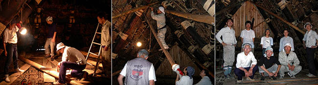 梅雨の最中にもかかわらず、すばらしい天気に恵まれて、朝から暑さすら覚えるなか、栗田さんの家の小屋で作業は始まりました。今回の作業は、10日に用意してくれた丸太を倒れかけた合掌材の支えに入れることです。さすがに7m余りの材となると、背の高い合掌材に当てて寸法を合わせるのもなかなか一苦労です。チェーンソーでこちらを削って合わせれば、あちらが合わず…。そのような作業を何度か繰り返して、夕方には4本の材がきちんと納まるべき所に納まったのでした。