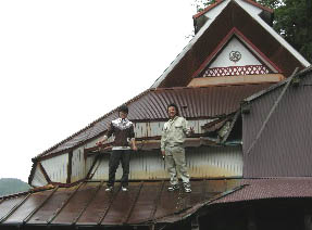 同じ集落にあるトタンをかぶった小さな民家の屋根の一部が強風で飛んでいるのを見つけたので、学生君たちに補修をしてもらいました。小雨で作業が危ないかなと思いましたが、よく錆びたトタンは滑りにくく、何とかうまくでき、ほっとしています。いつか、この空き家全体をきれいに治したいと考えています。(さのはるひと)