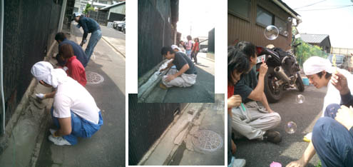 一方、学生たちには塀にこびりついて いる植物や埃を